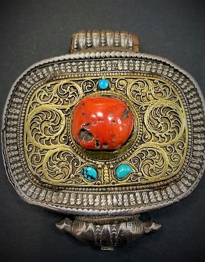 Bracciale decorato a sbalzo e cesello con otto simboli di buon auspicio del Buddismo lamaista: la Ruota del Dharma simbolo della creazione, sovranità e protezione, che rappresenta il movimento e il cambiamento; la Conchiglia simbolo di potere e sovranità; il Loto emblema di purezza ha analogie con il percorso dell'anima dal fango all’illuminazione; il Parasole (o ombrello) rappresenta sia di protezione che di regalità; il Nodo Senza Fine simboleggia il modo in cui tutti i fenomeni sono interdipendenti tra loro e la continuità degli eventi cosi come l'infinita conoscenza e saggezza del Buddha; i Pesci rappresentano la felicità, dovuta alla loro libertà in acqua, fertilità e abbondanza; il Vessillo della Vittoria della saggezza sull’ignoranza; il Vaso del Tesoro rappresenta lo spirito inesauribile del Buddha, la longevità e la prosperità.