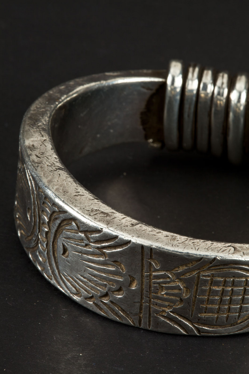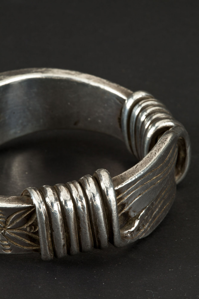 Bracciale del nord della Thailandia, presenta decorazioni incise a motivi floreali, terminante da una doppia spirale in filo ritorto.