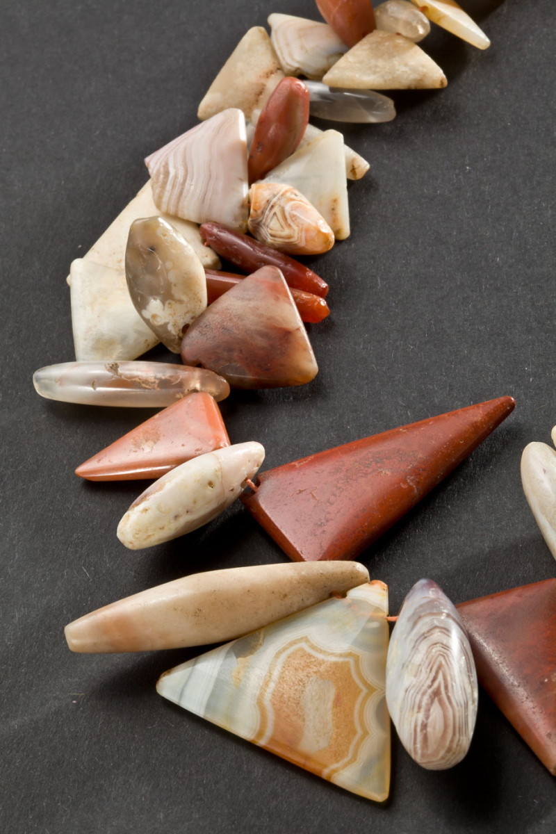 Collana formata da perline di agate di forma e misura diverse provenienti da siti archeologici della civiltà Harappa nella Valle dell’Indo. La civiltà Harappa produsse le più raffinate perline in agata e corniola dell’antichità, che rappresentano l’espressione della più alta tecnologia arcaica nella realizzazione di perle per ornamenti.
