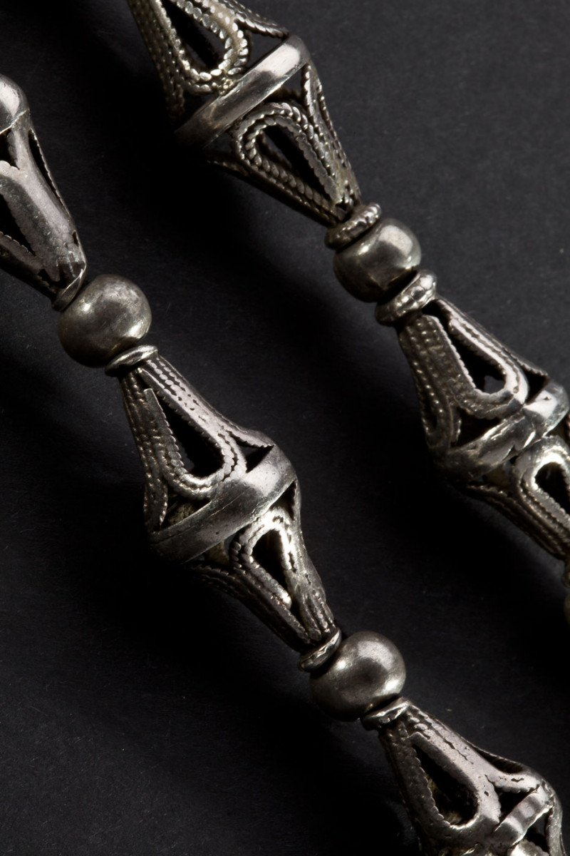 La collana è formata da antichi elementi in argento, alcuni caratterizzati da una particolare decorazione a micro granulazione, altri con lavorazione a filigrana, levigati e patinati.