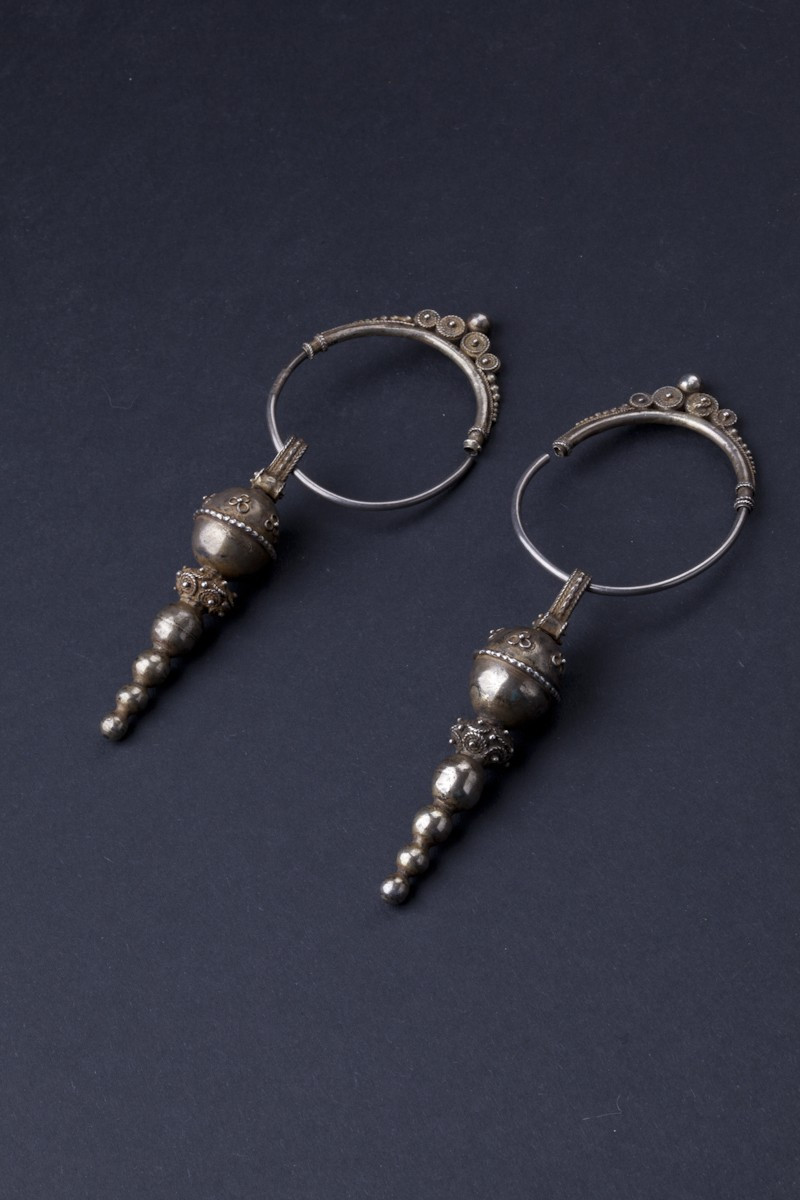 Questi orecchini, indossati dalla etnia indonesiana Karo Batak, sono composti da una parte a cerchio con un lungo pendente, formato da più sfere decrescenti decorate da micro granulazione.