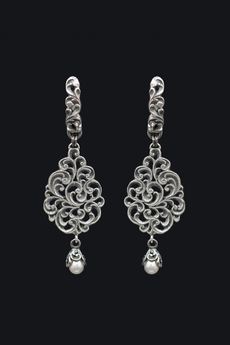 Orecchini pendenti con scattino al lobo, caratterizzati da un elemento centrale in argento brunito e inciso a mano, con l'antica tecnica del bulino. Le gocce finali in perle naturali, conferisco all'accessorio unicità e carattere.