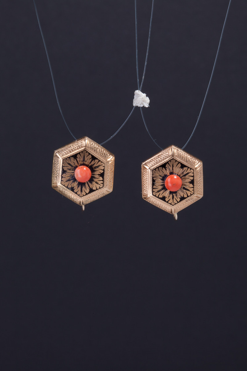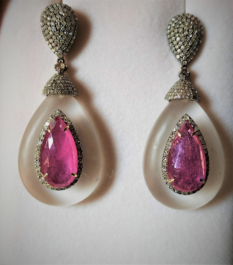 Orecchini stile déco in oro bianco con grandi cerchi pendenti in giada, impreziositi da brillanti e smalti rossi, con aggancio in onice e rubini.
